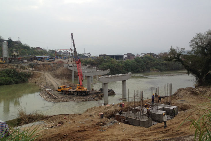 下午16時30分,公司下屬機械分公司副經(jīng)理朱超群、該項目部經(jīng)理汪承亮下達開始架梁的命令?,F(xiàn)場頓時掌聲雷動,禮花飛舞。在雙滑輪組的勻速滑輪中,空心板梁被緩緩?fù)扑偷轿?,徐徐降落固定,?jīng)過近40分鐘的精心操作,S347炎陵石潮至壟下公路新河漠大橋4#-5#墩5-3#空心板中梁順利架設(shè)成功。