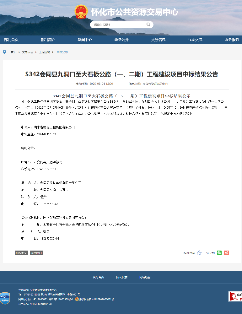 2025年3月4日,懷化市公共資源交易中心發(fā)布了S342會同縣九洞口至大石板公路(一、二期)工程建設項目中標結果公告顯示,中標人:湖南省交建工程集團有限公司,中標金額:150142410.00元,工期730日歷天。本次招標采用公開招標方式,經過嚴格的技術評審和商務評審,最終湖南省交建工程集團有限公司憑借優(yōu)異的技術方案、合理的報價和豐富的施工經驗成功中標。