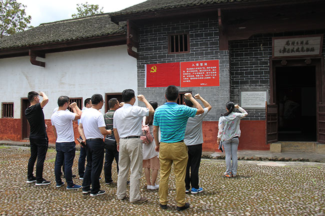 隨后,一行人到達水口鎮(zhèn)連隊建黨舊址。水口鎮(zhèn)連隊建黨舊址——葉家祠1972年被公布為湖南省重點文物保護單位,已被定為株洲市愛國主義教育基地。祠堂門口懸掛著鮮明的黨旗及入黨誓詞,肅穆莊嚴,公司黨員在此重新宣讀入黨誓詞,內(nèi)心激動澎湃的感情溢于言表。誓詞提醒著每一位黨員的承諾與信仰,他們將牢記自己的使命,從群眾中來到群眾中去,發(fā)揮黨員帶頭作用。